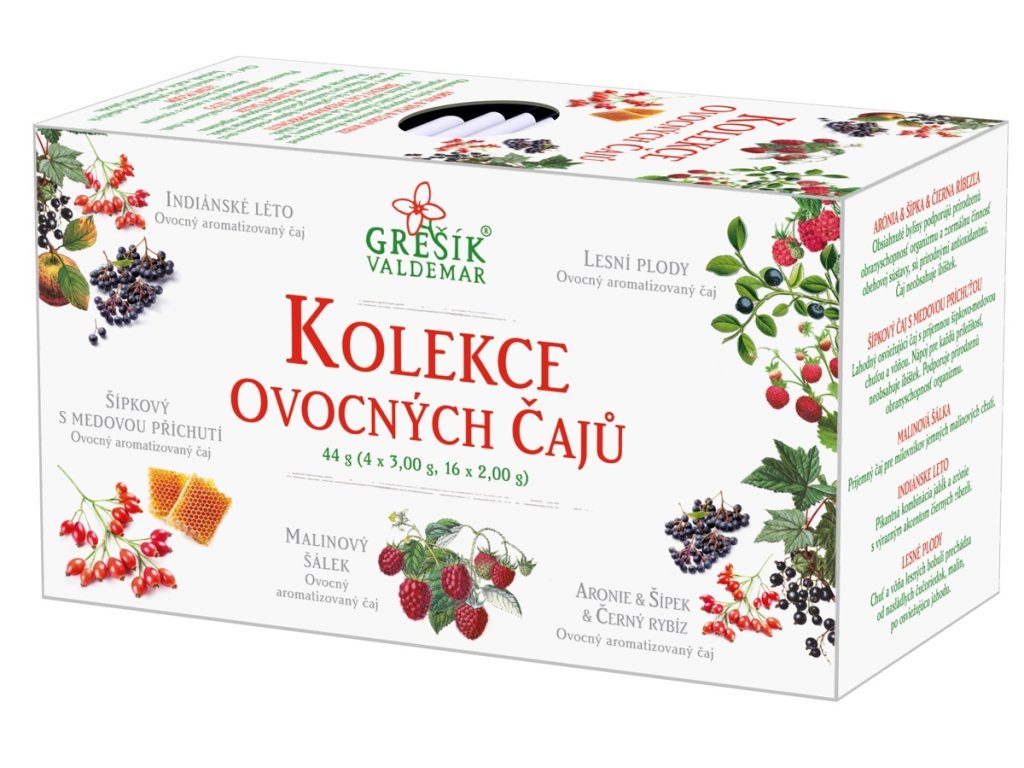 Kolekce obsahuje 5 druhů ovocných čajů: Aronie & Šípek & Černý rybíz, Šípkový čaj s medovou příchutí, Malinový šálek, Indiánské léto a Lesní plody