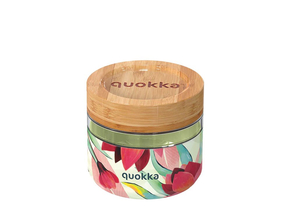 Dóza na potraviny je vyrobená z kvalitního borosilikátového skla je opatřena bambusovým víčkem, které podtrhuje její design. Je 100% nepropustná, nemusíte se tedy obávat, že by vám její obsah nechtěně unikl do batůžku či tašky.
