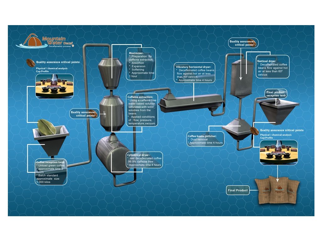 Švýcarský vodní proces se obejde bez organických činidel. Káva je vylouhována v horké vodě, čímž se vytvoří extrakt zelené kávy (GCE; green coffee extract) a dojde k prvnímu uvolnění kofeinu ze zrn. Následně je extrakt přefiltrován přes uhlíkový filtr, který pohltí kofein (adsorpcí na uhlíkový filtr) a celý výluh se poté vrací zpět do oběhu - kávová zrna se opět namočí a vymění svůj kofein za extrakty zelené kávy ve výluhu, vše díky chemicko-fyzikálnímu jevu zvanému osmóza. Celý tento proces se opakuje, dokud v kávě není 0,01% zbytkového kofeinu. Poté je káva usušena a připravena k pražení. Díky použití GCE si káva dokáže zachovat většinu svých chuťových vlastností.