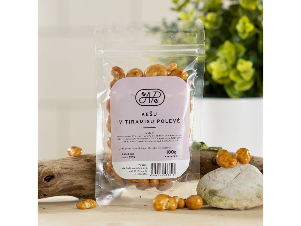 Složení: tiramisu poleva 69% (cukr, rostlinný olej palmový, syrovátka z mléka, rýžová mouka, slunečnicový lecitin E322, arabská guma, šelak E904, tiramisu příchuť, kakaová hmota, kakaové máslo), kešu 31%