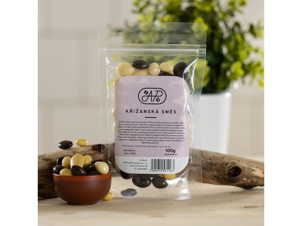 Složení: Arašidy v jogurtu: jogurtová poleva 55% (cukr, rostlinný tuk palmový, syrovátka z mléka, rýžová mouka, jogurtový pudr z mléka 2,5%, slunečnicový lecitin E322, arabská guma ,šelak E904), arašídy 45%, Arašidy v karobu: karobová poleva 55% (cukr, rostlinný tuk palmový, syrovátka z mléka, pudr ze svatojánského chleba 5%, rýžová mouka, slunečnicový lecitin E322, arabská guma, šelak E904), arašídy 45%, Rozinky v jogurtu: jogurtová poleva 66% (cukr, rostlinný tuk palmový, syrovátka z mléka, rýžová mouka, jogurtový pudr z mléka 3%, slunečnicový lecitin E322, arabská guma, šelak E904), rozinky 34%, Rozinky v karobu: karobová poleva 65% (cukr, rostlinný tuk palmový, syrovátka z mléka, pudr ze svatojánského chleba 5,7%, rýžová mouka, slunečnicový lecitin E322, arabská guma, šelak E904), rozinky 35%